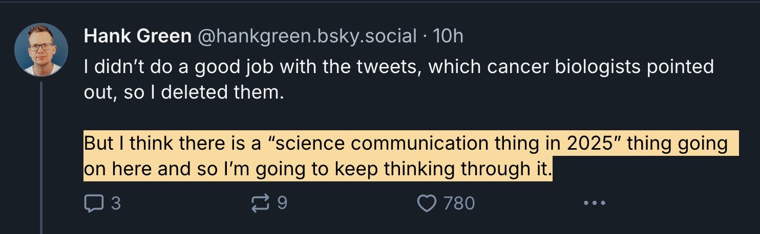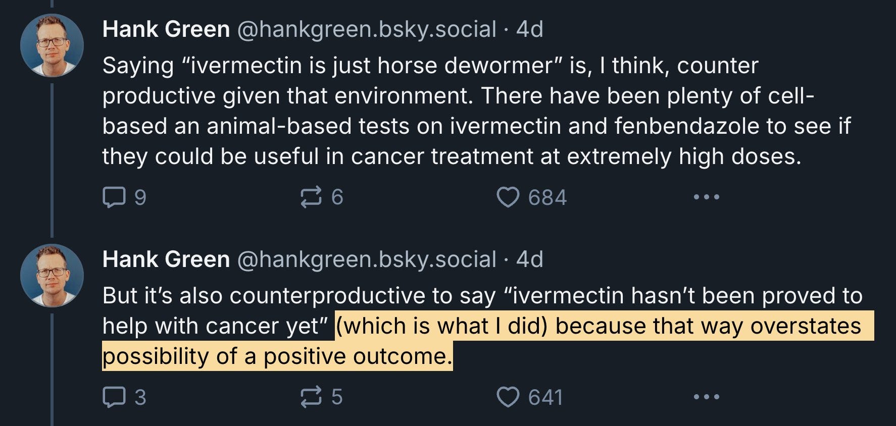 This is another “clue” that Hank is memetically aware: he knows that people go to him for that role, and he reinforces that by mentioning that people do that. In addition to bringing it up explicitly in his videos, in one of his newsletters he brought up how some external survey lists him as “a trusted news source”. Showing that people trust you is a great way to get more people to trust you.