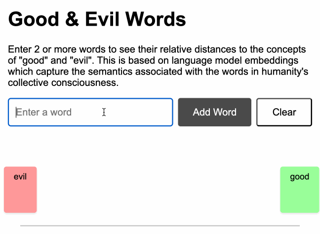 In it he talks about the tool I made to “query the collective consciousness”, using LLM embeddings. You can pick any two “poles”, and then test any set of words along that axis. The default poles I have are “good” and “evil”. And most things fall where you’d expect: