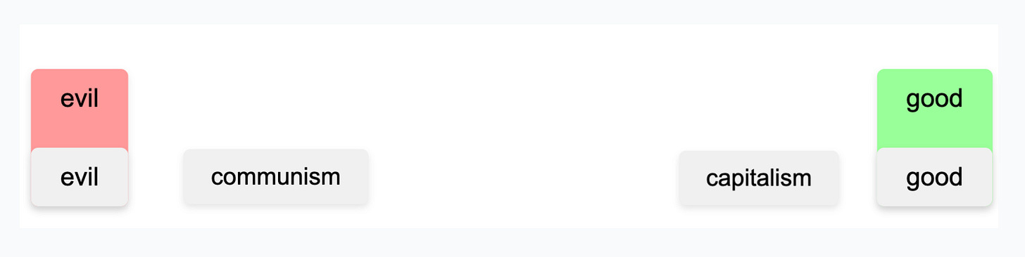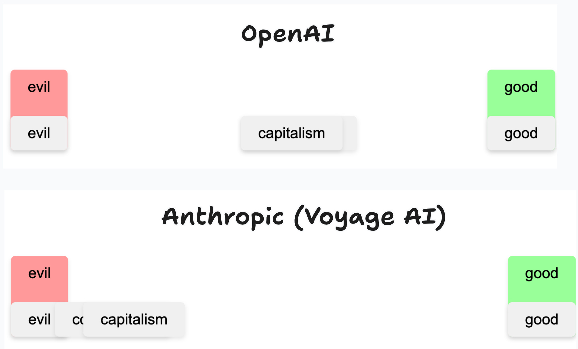 So, where does the LLM put it? Given that its training data includes all these groups. Here is the answer below. Using OpenAI’s embedding model, they both fall in the middle, with “communism” being slightly more good. With Anthropic’s model, they both fall very close to evil, but capitalism is better.