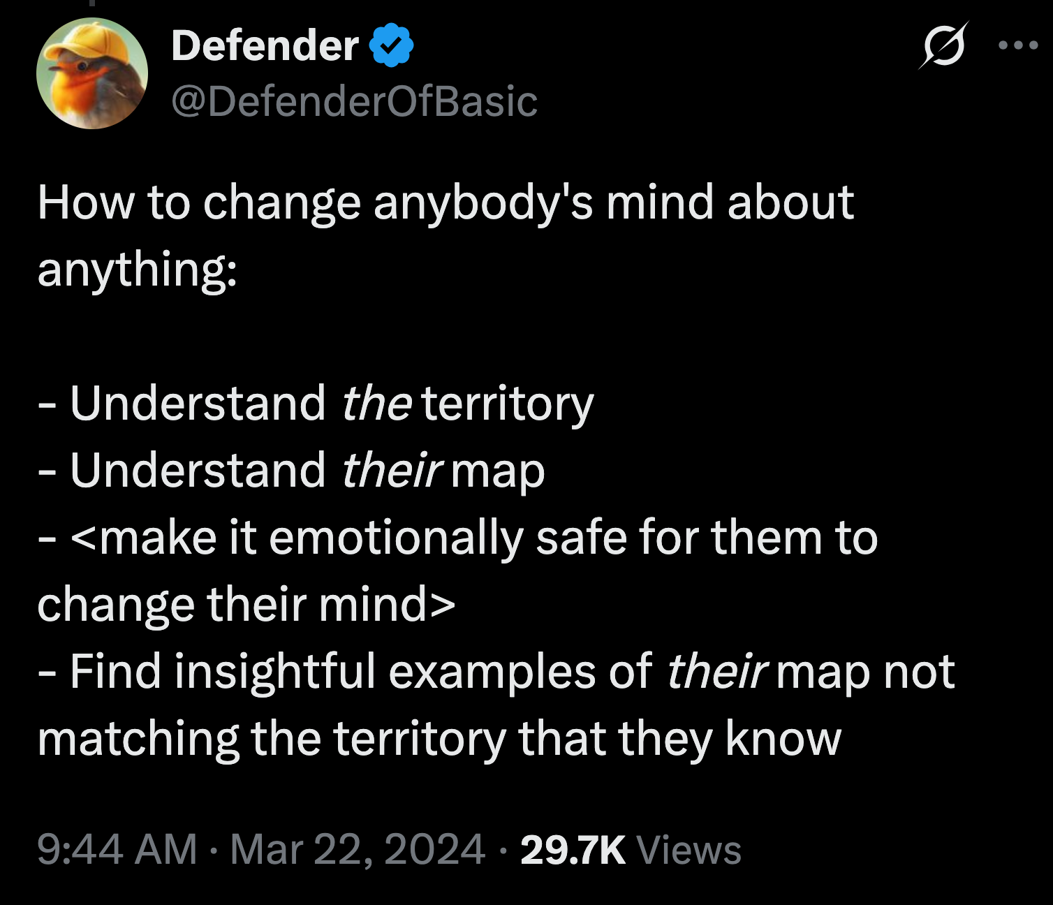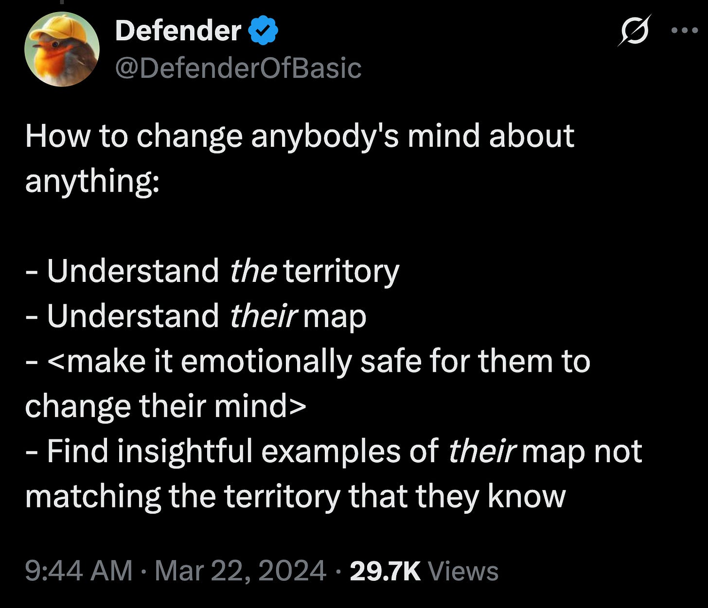 I wrote about the techniques I discovered because I wanted people to try & reproduce it, or falsify it. This is a science experiment without deception. You genuinely want to change people’s minds, because you believe your position is correct. I needed to find “sustainable methods” for mass adoption, something that still works even if everyone did it. But that also still had benefit even if only YOU did it (to avoid the cold start problem of mass behavior change).