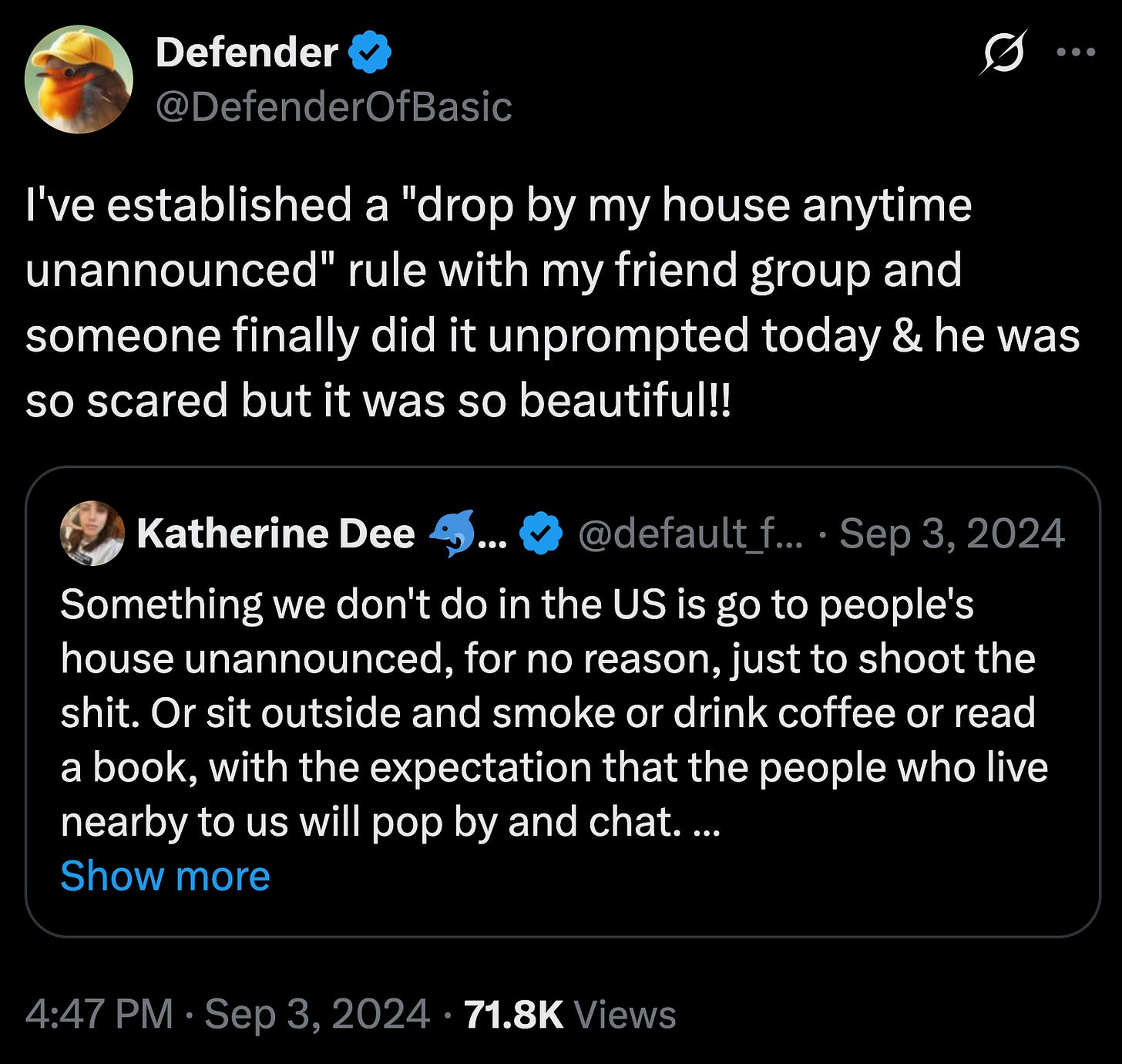 On one level, I do this with my IRL friend group. We’ve been prototyping ways to create a culture of “drop by unannounced”. I’d categorize this as under the umbrella of “fixing the loneliness epidemic”. If we find something that works, we can write it up. Others can then “peer review” this by trying it themselves & reporting back.