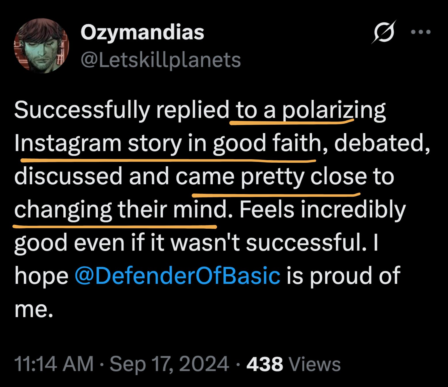 Turns out: I was right. The more I did these internet argument case studies, the more perception began to shift. I started getting messages like this, where people try the methods & report back when it works. Which itself further spread the method, and further shifted the perception in the direction I envisioned.
