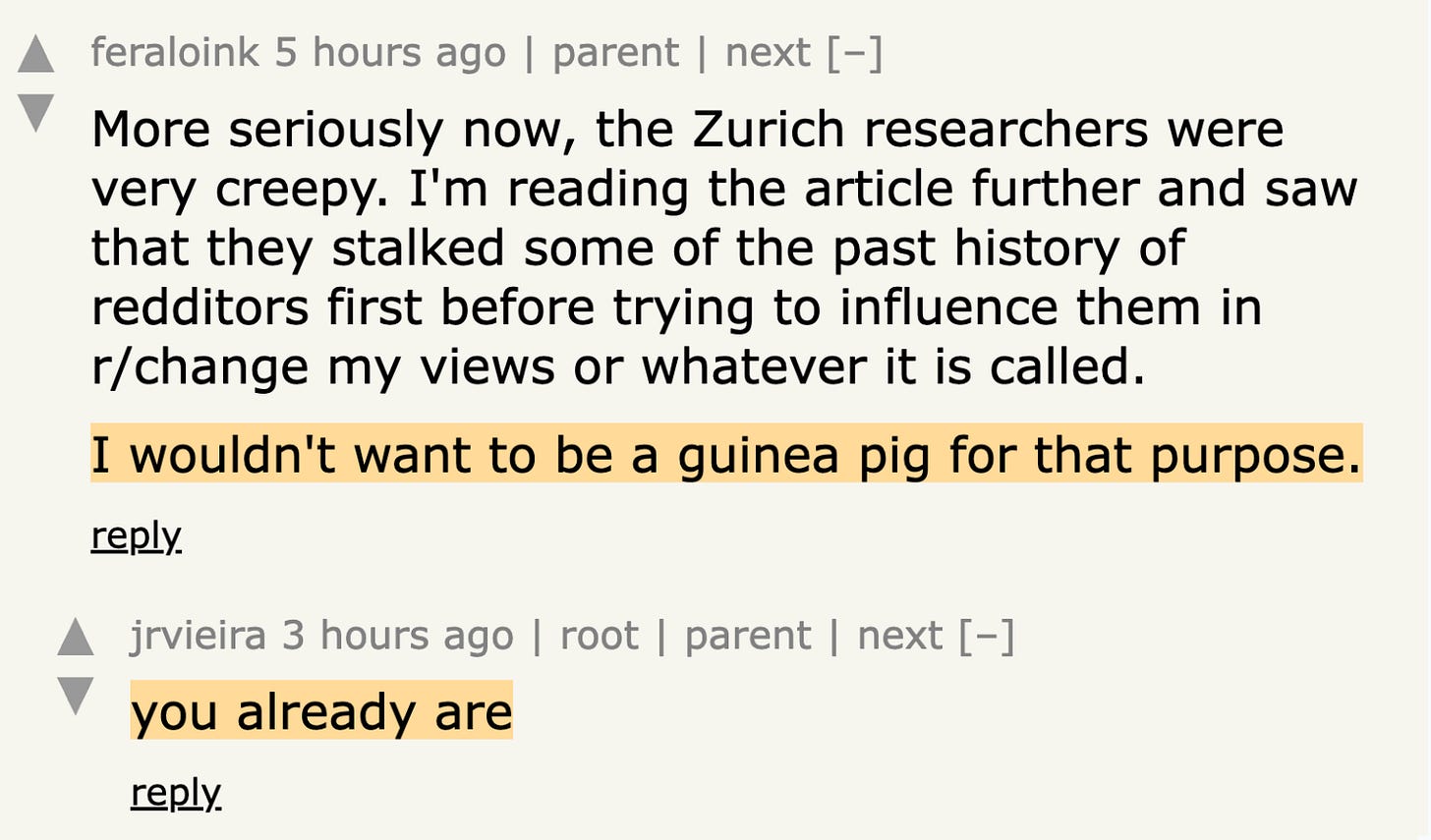 There is a subreddit called r/ChangeMyView where people go to understand each other’s beliefs. When someone’s successfully changes their mind or has a perspective shift, they celebrate & mark that as a “delta”. On April 26th, this community found out that researchers from the University of Zurich had been testing how LLM bots can be used to change real people’s minds. They had been doing this for months, they found out now because the research team was disclosing it before publication.