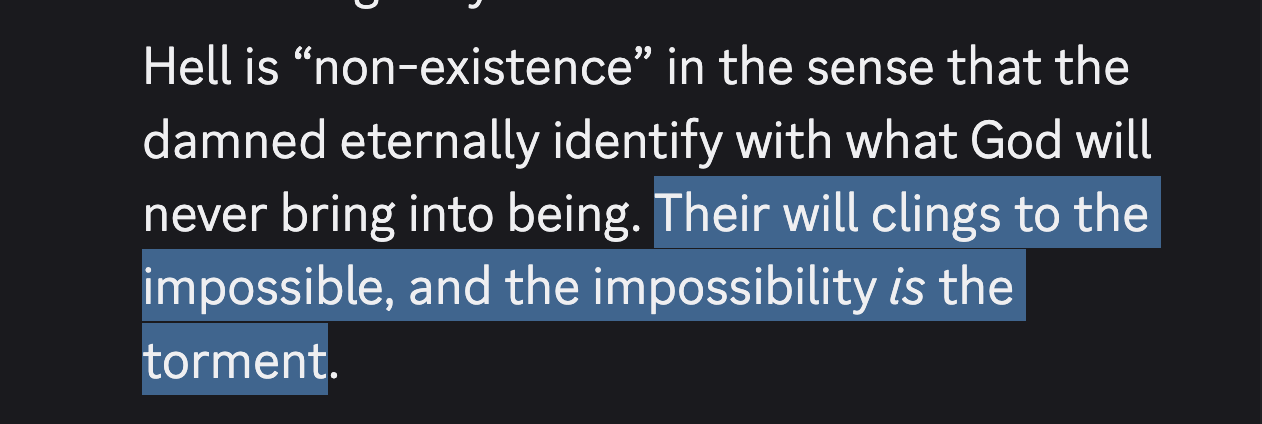 I now understand what they mean when they say “the gates of hell are locked from the inside”. A loving god does NOT put you there and choose to torture you. Sᴜɴʀɪsᴇ Oᴀᴛʜ, who is my go-to for Christian metaphysics/theology, explains it as “the state in which your will continually tries to actualize, but never does”: